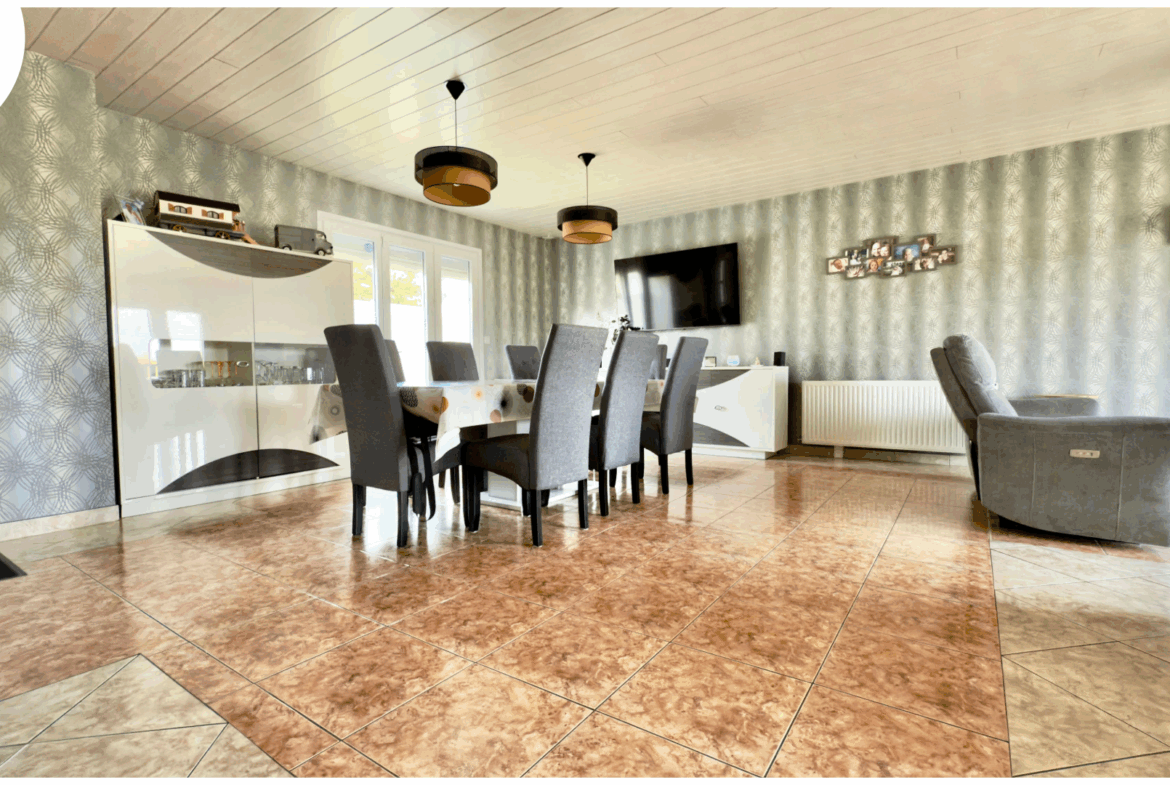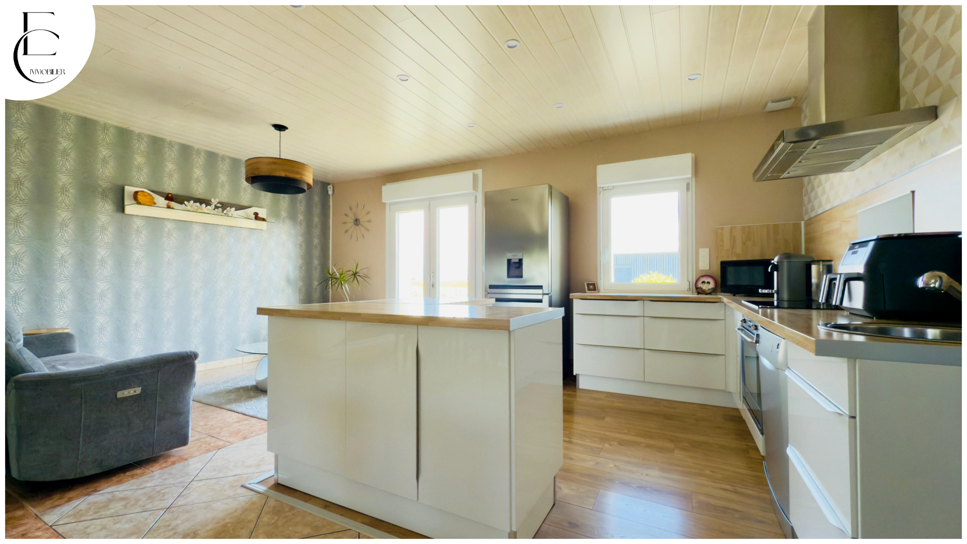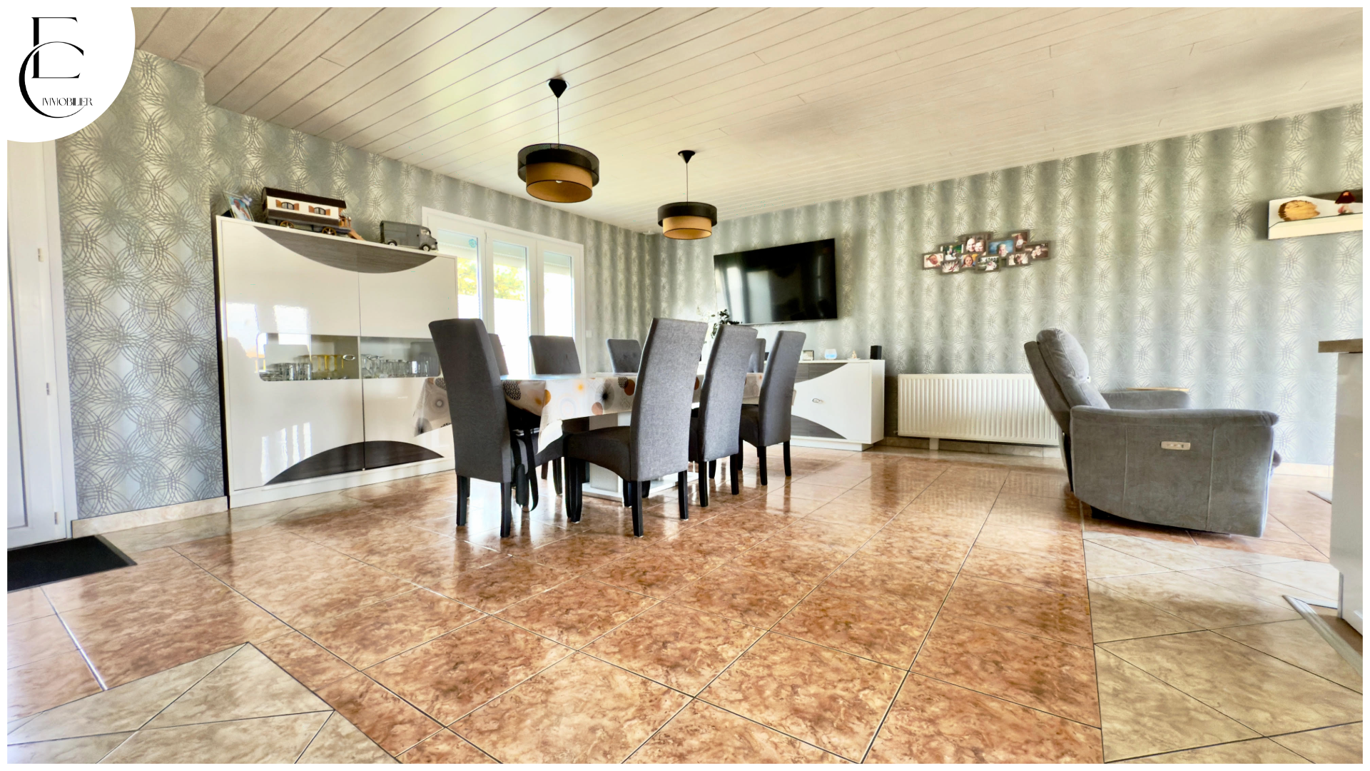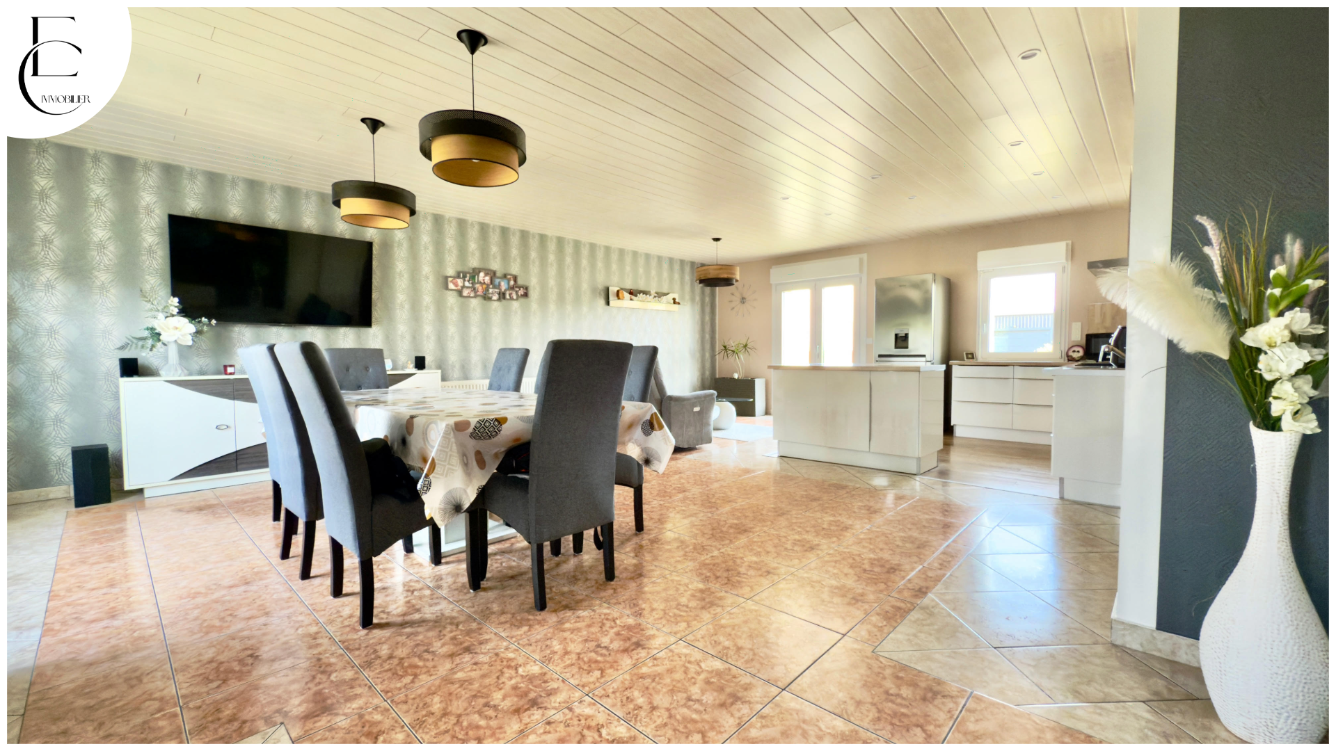 salon-séjour avec cuisine équipée (51m2), 3 belles chambres, 4 pièces en sous sol complet aménagés avec garage 2VL, jardin clos (expo Est) + Hangar de 120m2.