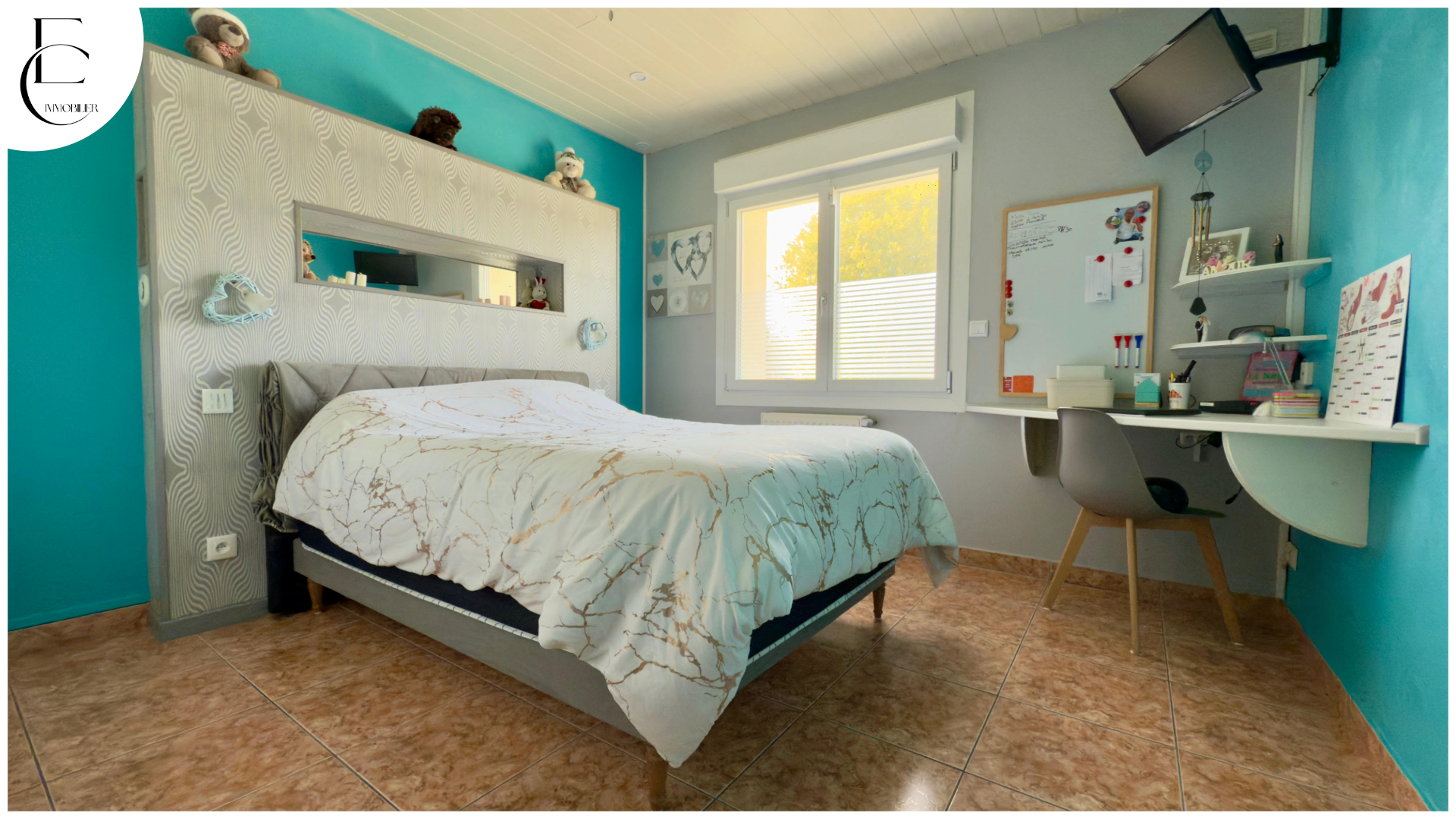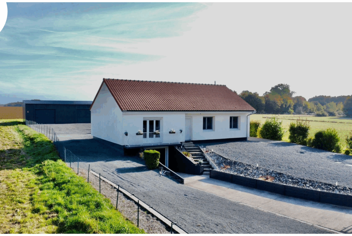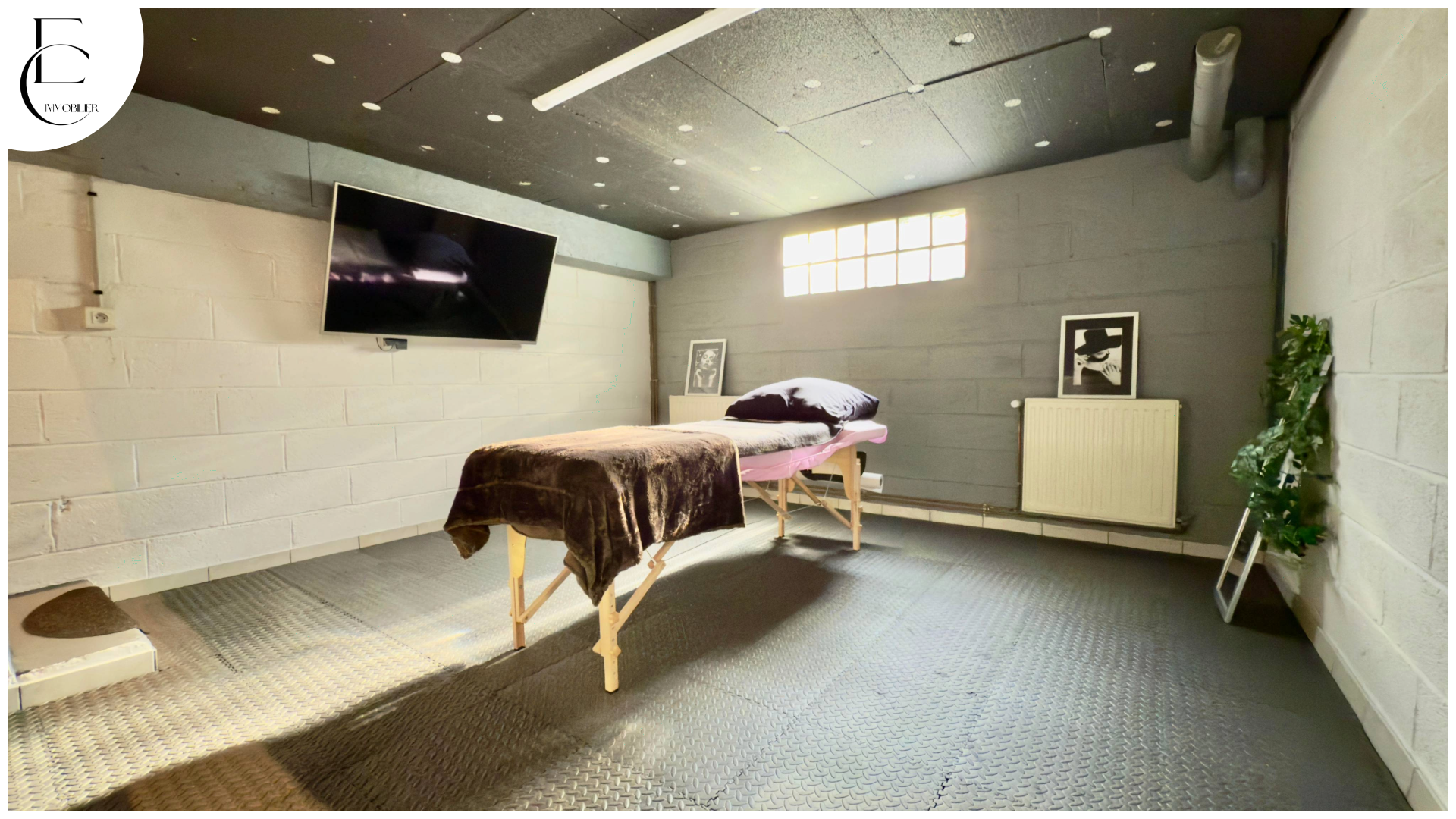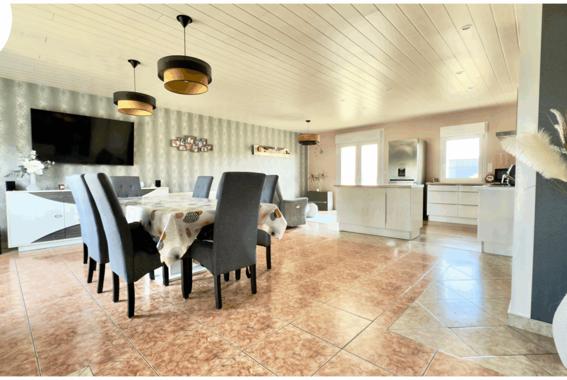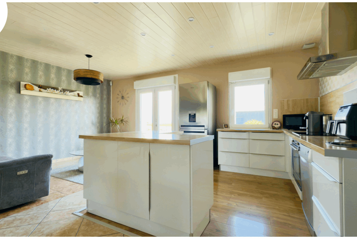 salon-séjour avec cuisine équipée (51m2), 3 belles chambres, 4 pièces en sous sol complet aménagés avec garage 2VL, jardin clos (expo Est) + Hangar de 120m2.