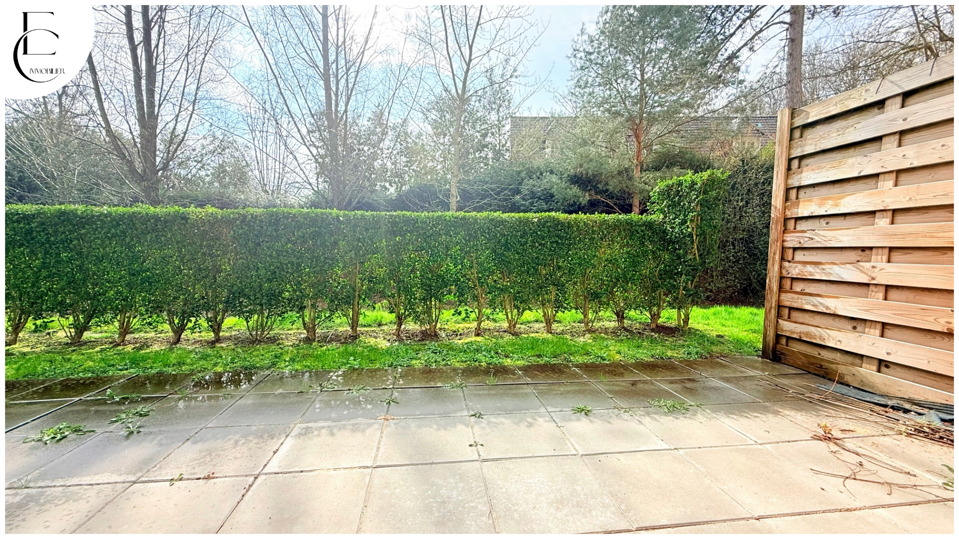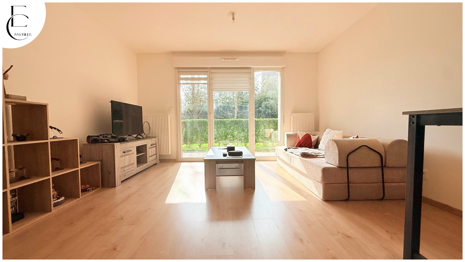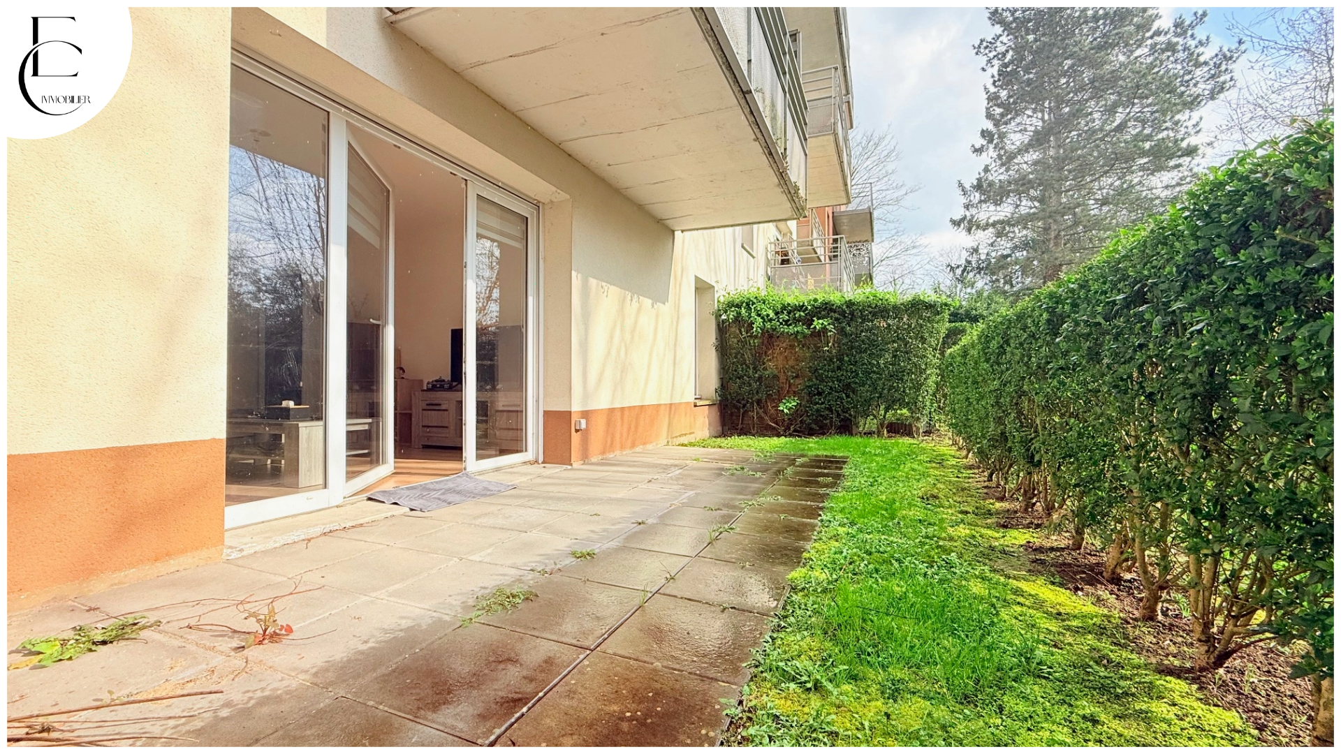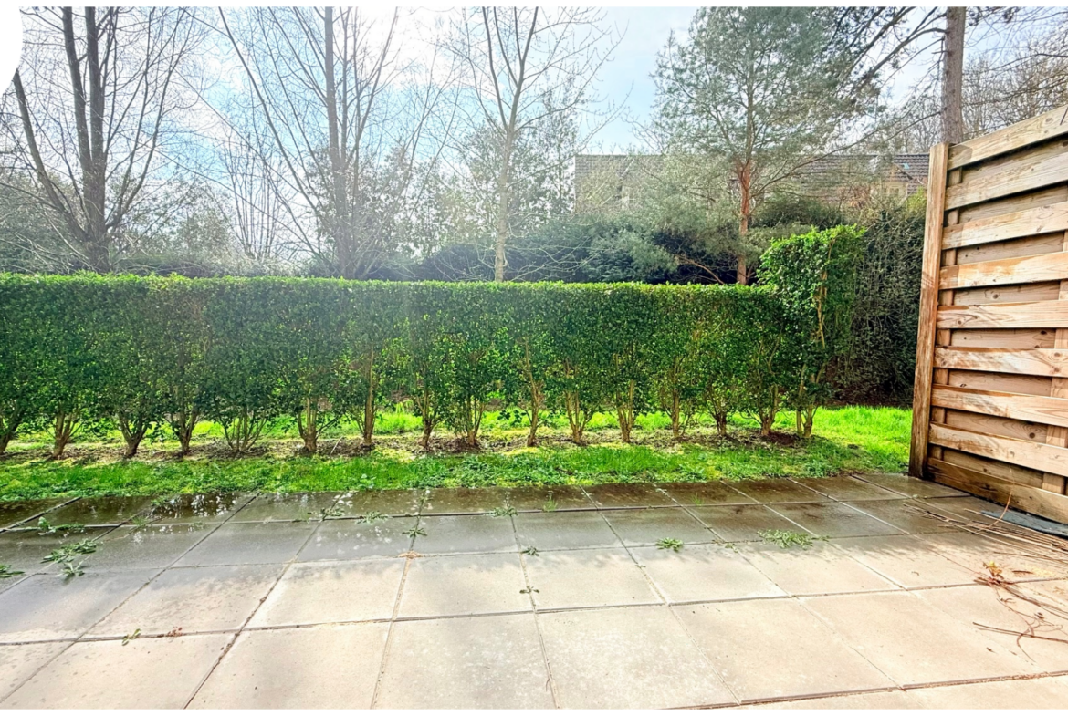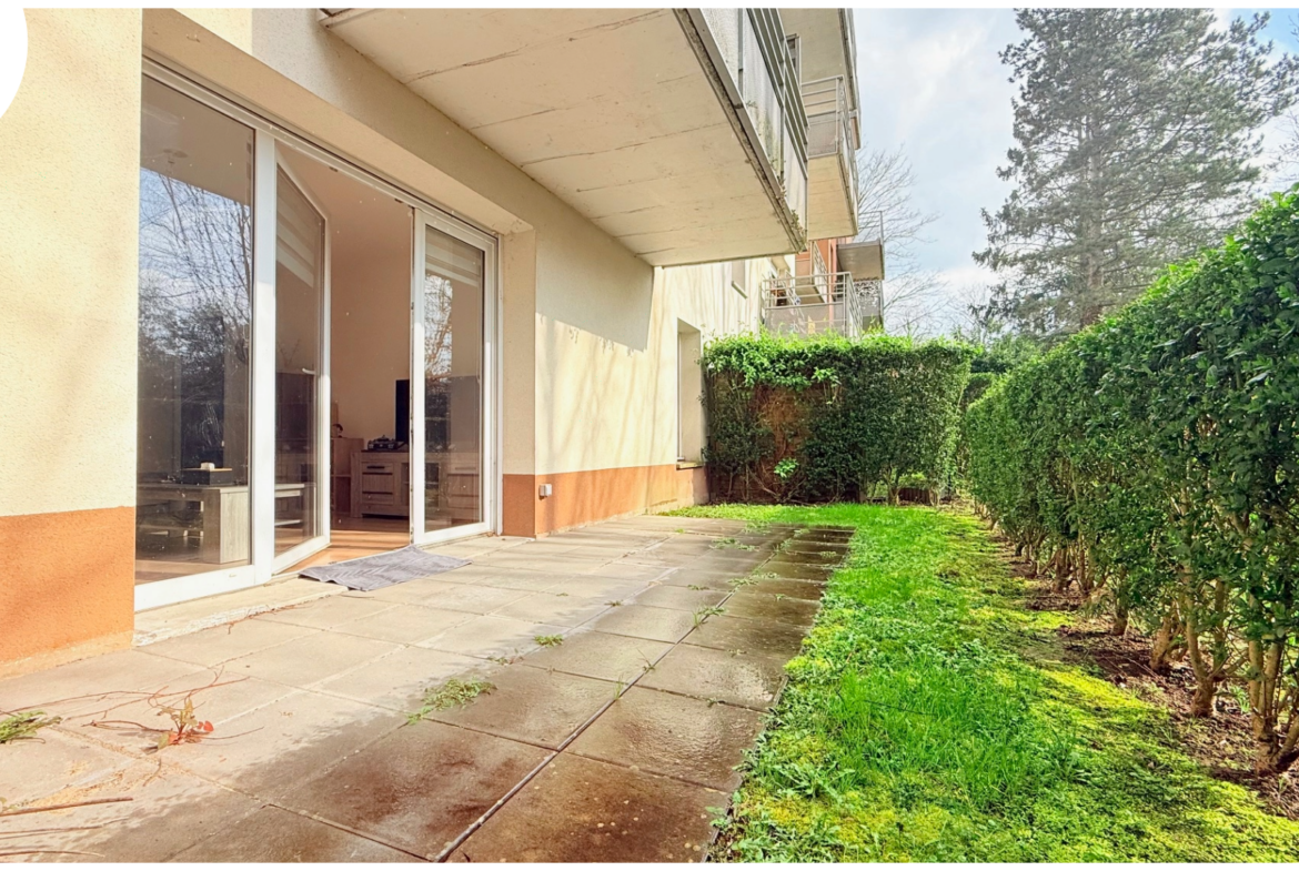 Entrée, salon-séjour avec cuisine toute équipée, chambres, salle de bains, terrasse, jardin (expo Sud)