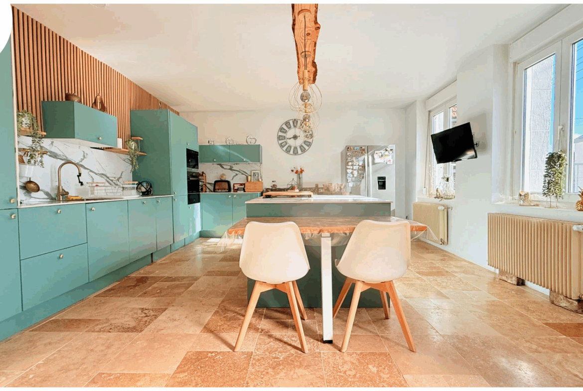 Une entrée, un open space (salon-séjour + cuisine équipée 75m2 en L )
