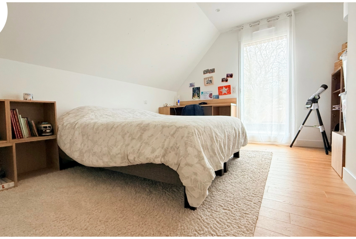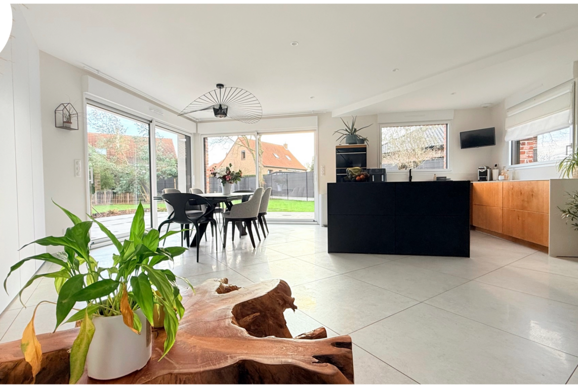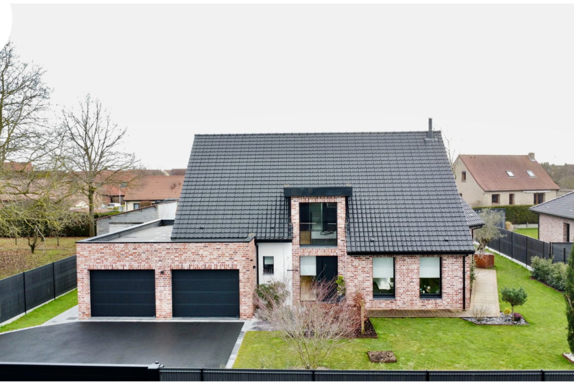 une entrée cathédrale, Open Space de 65m2 avec cuisine toute équipée, 3 chambres (dont une suite parentale au RDC + possibilité 5 chambres ), 2 salle de bains, sous-sol complet avec buanderie, double garage attentant, terrasse (90m2), jardin arboré et clos, chauffage aérodynamique..